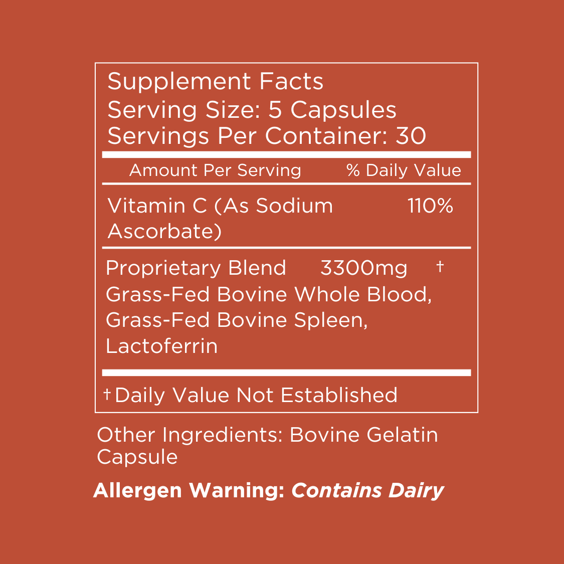Grass-Fed Bovine Whole Blood, Grass-Fed Bovine Spleen, Corn & Soy Free Vitamin C (Sodium Ascorbate) Lactoferrin