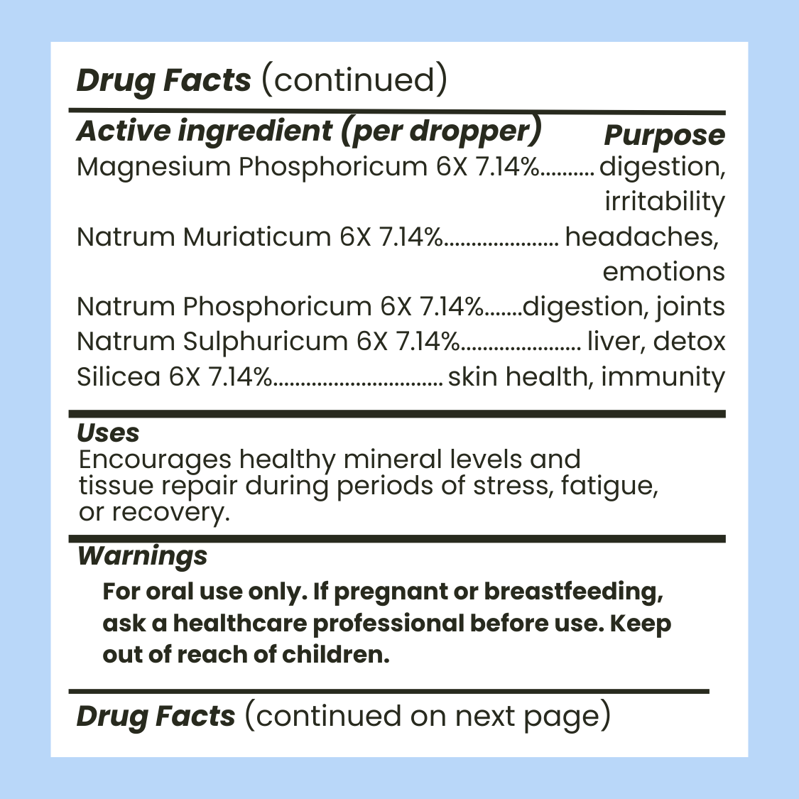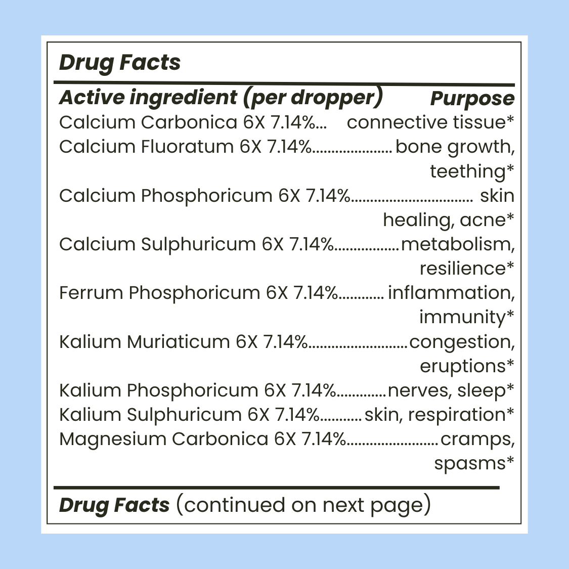 Calcium Carbonica 6X, Calcium Fluoratum 6X, Calcium Phosphoricum 6X, Calcium Sulphuricum 6X, Ferrum Phosphoricum 6X, Kalium Muriaticum 6X, Kalium Phosphoricum 6X, Kalium Sulphuricum 6X, Magnesium Carbonica 6X, Magnesium Phosphoricum 6X, Natrum Muriaticum 6X, Natrum Phosphoricum 6X, Natrum Sulphuricum 6X, Silicea 6X